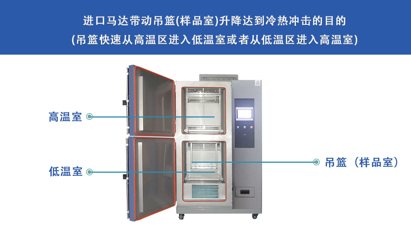 德祥仪器二箱冷热冲击试验箱箱体布局冲击试验箱设置高温室和低温室,试件放置在吊篮内,随吊篮在高、低温室内移动,实现温度冲击。小型冲击试验箱为立式结构,上部为高温室下部为低温室,中大型冲击试验箱为卧式结构,左部为低温室,右部为高温室。高温室、低温室均有大门,开门后可以完全接触到测试室。透过门体上的多层真空电热玻璃观察窗及照明可以随时了解试验样品的状态,吊篮采用气动平移,高、低温箱间密封效果好,控制器液晶触摸屏安装在箱体右侧控制面板上,操作便捷。安全防护具有针对操作人员、试验箱、试件等全方位的安全保护。